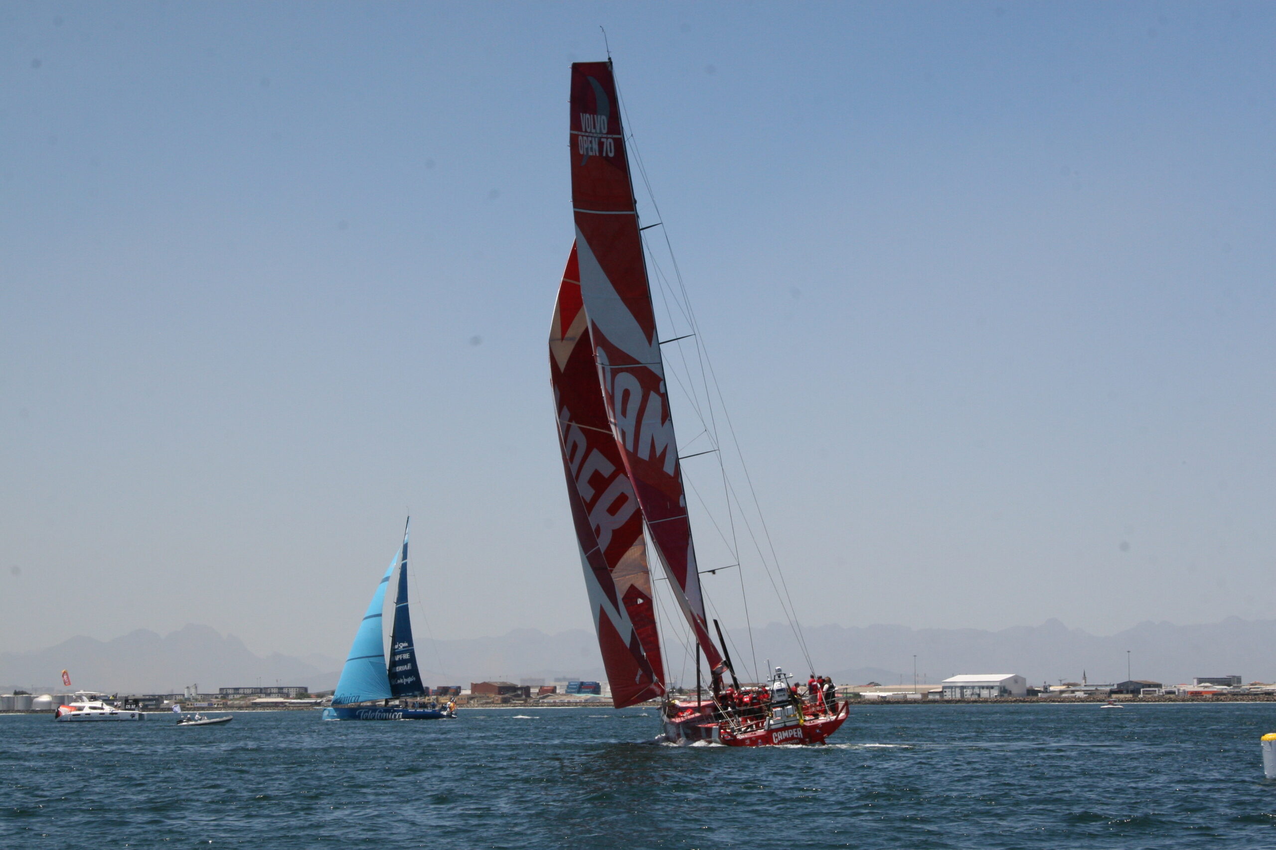 After waving goodbye to the sailing out Volvo Race boats as they headed south, Guppy and I left Cape Town and Table Mountain behind us. We will be at sea for the coming time. We started with a nice wind and we are sailing on a close tack. Then the wind shifted and picked up and it is now blowing directly from ahead at 25 knots so we had to reef the sails and we are not heading on a perfect course with the waves constantly washing over – as I left Cape Town I already knew that the first 500 nautical miles would not be easy sailing. At some point the weather will improve but for now I just have to tough it out. Because of the ship traffic around here I did not sleep much and I feel the fatigue. I hope to catch up on some sleep today cat napping. So all is well onboard and I just need to fall back into my sea rhythm but I feel great and very soon I will be used to the waves washing over and having things all wet..