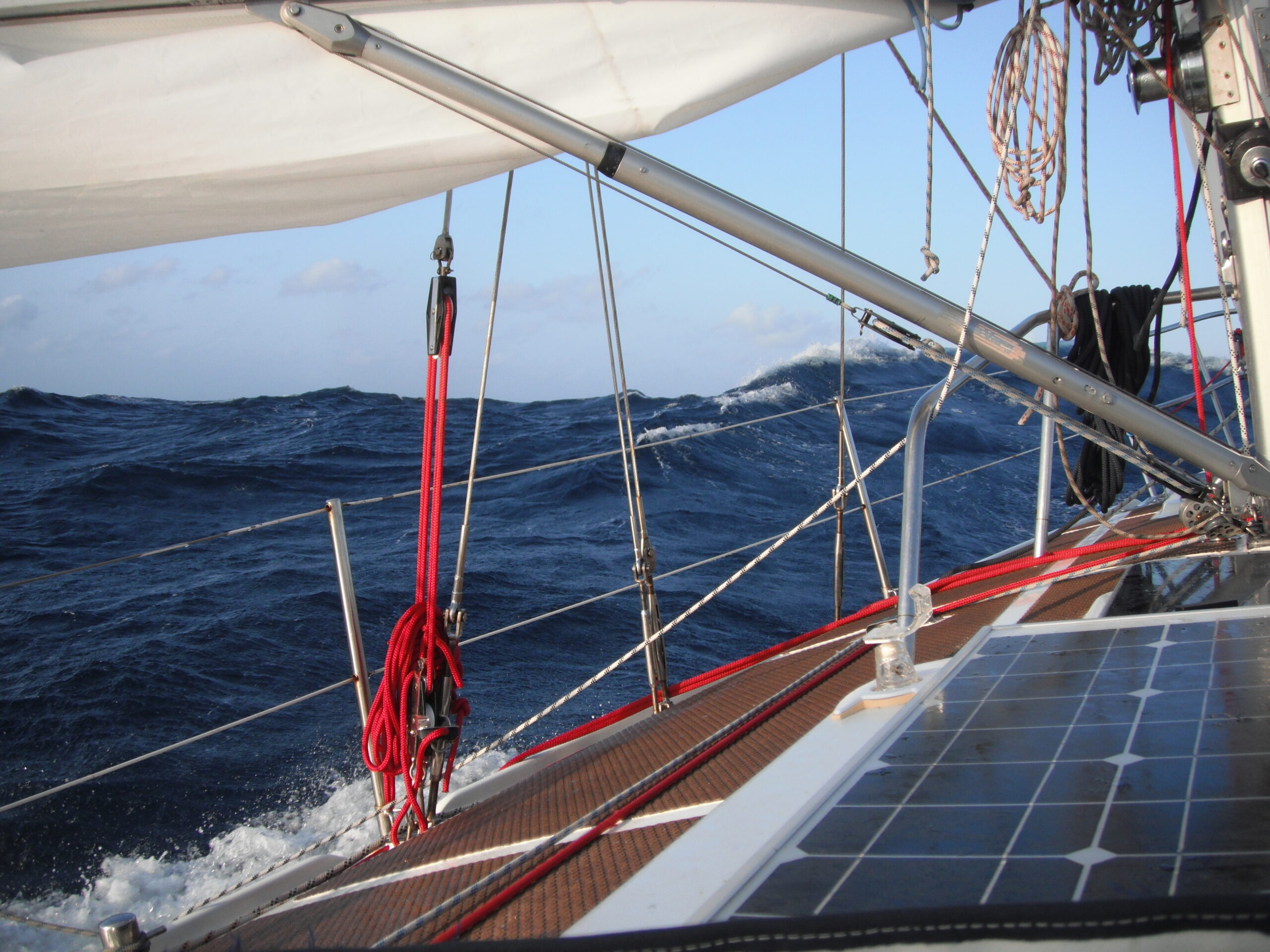 This morning the strong winds had not stopped blowing and unfortunately the sun also did not show up. I had hoped that the wind would decrease, but then I spotted the first small palm islands and I gave up my hope that it would. Instead I was welcomed by a school of dolphins one of which jumped three metres out of the water right in front of the bow, it was really great. Slowly the islands became larger and I saw waves surging onto the reef. We approached with a reef on the lee side and windspeeds still at 25 knots [46 kilometres or 29 miles per hour; force 6 on the Beaufort scale] and a high swell… The anchorage is located between the reefs and the small islands… By VHF-radio I asked if someone could pilot me in. I received an answer immediately and a short time later I was sailing behind a dinghy through the reefs towards the cloudy version of a “Bounty advertisement-trailer”. The islands are just full of palm trees and pristine white beach. It is so beautiful.